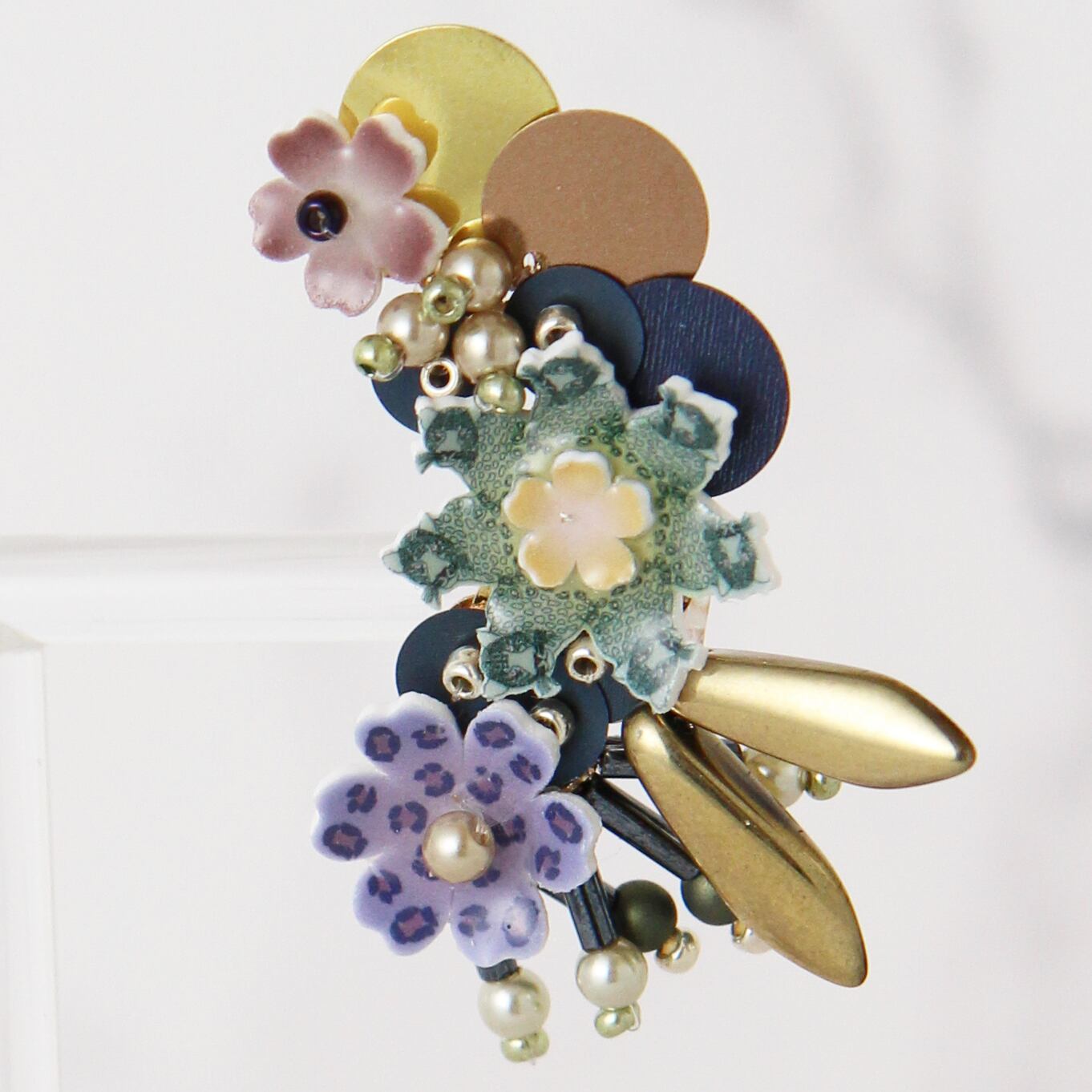 デザインのおもしろさだけでなく、チェコビーズ、スパンコール、樹脂パールなどを組み合わせ、大変華やかなアクセサリーです。