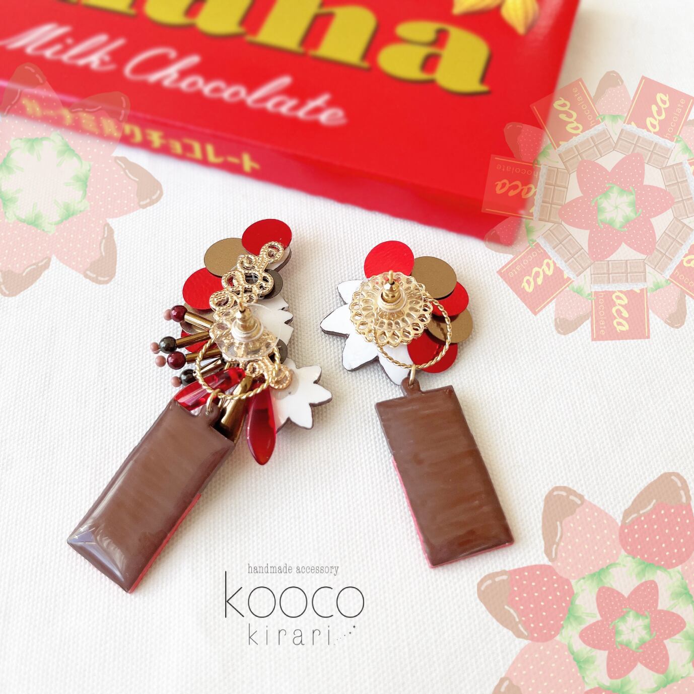 チョコがお花に⁉️ 板チョコ&いちごチョコの月形ピアス/イヤリング(2way仕様)