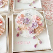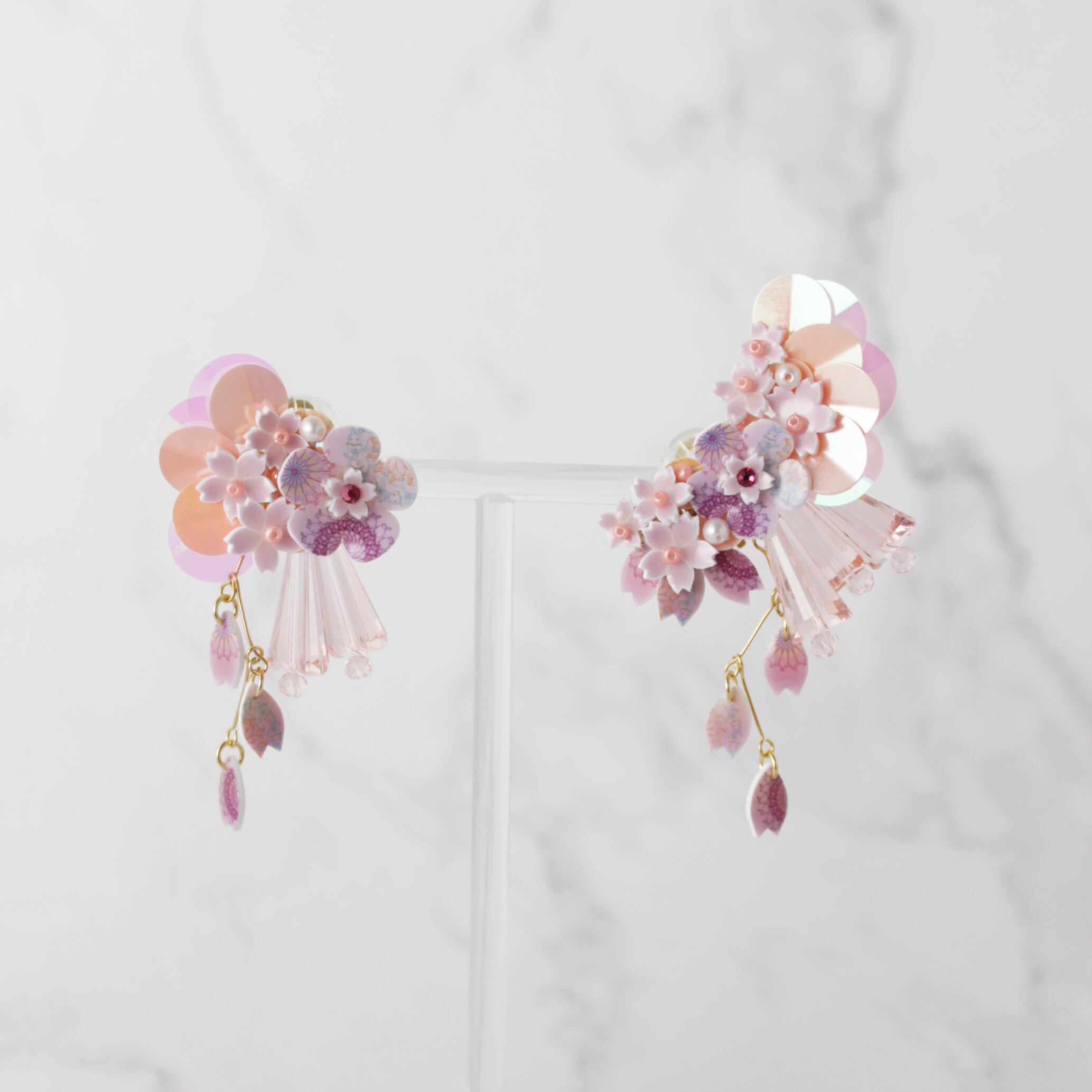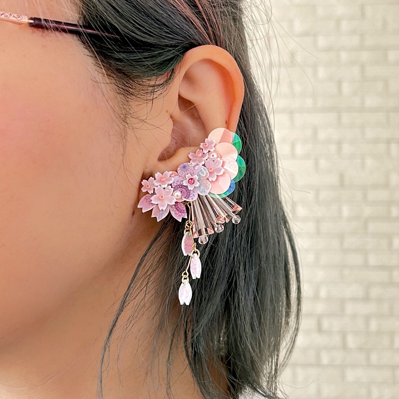 大小様々な桜チーフをバランスよく配置し、耳元を華やかに演出します。視線が耳元に集まることで、自然と小顔効果も期待できます。
