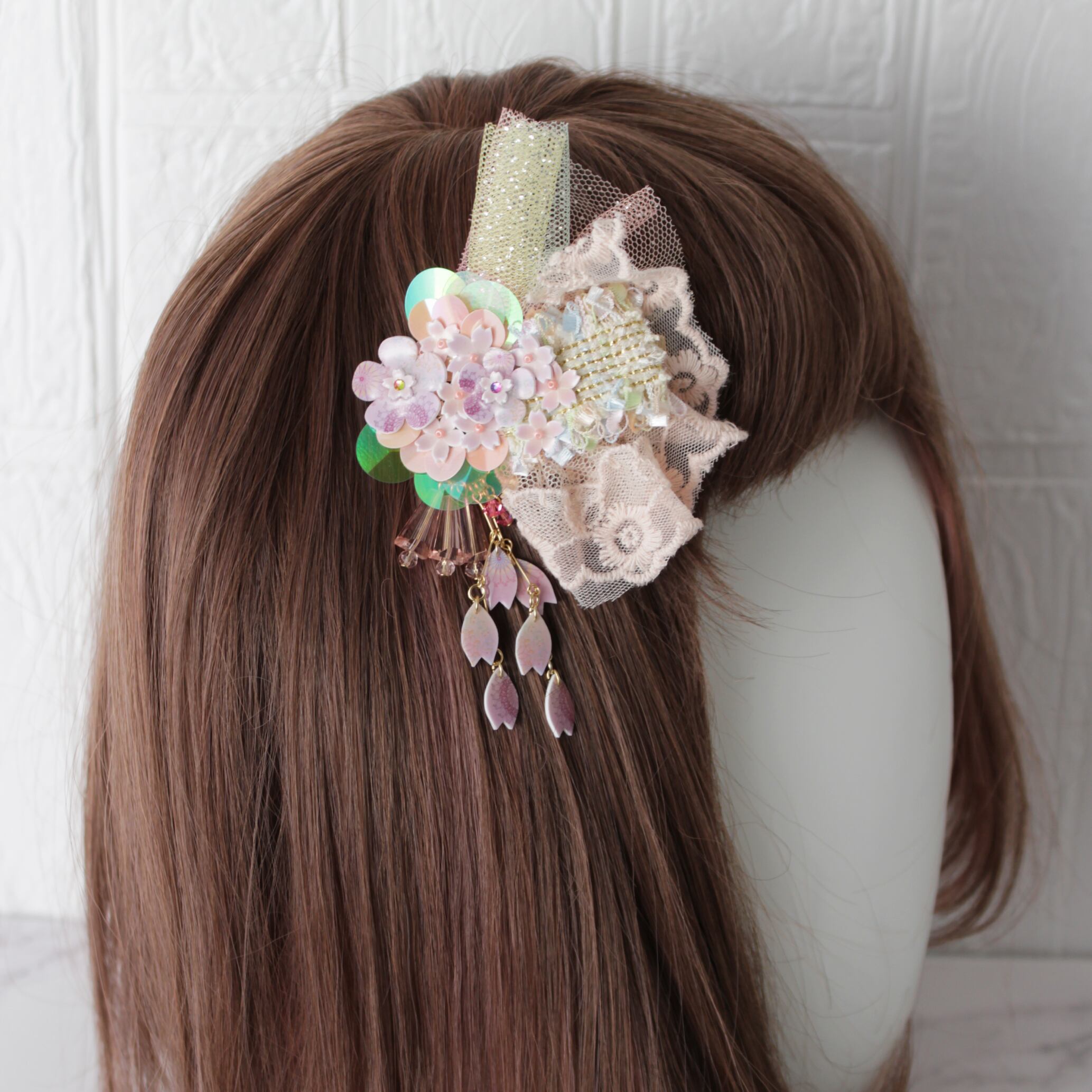 大小様々な桜チーフをバランスよく配置し、レースやツイードリボン、ガラスビーズと合わせて大変華やかなデザインです。