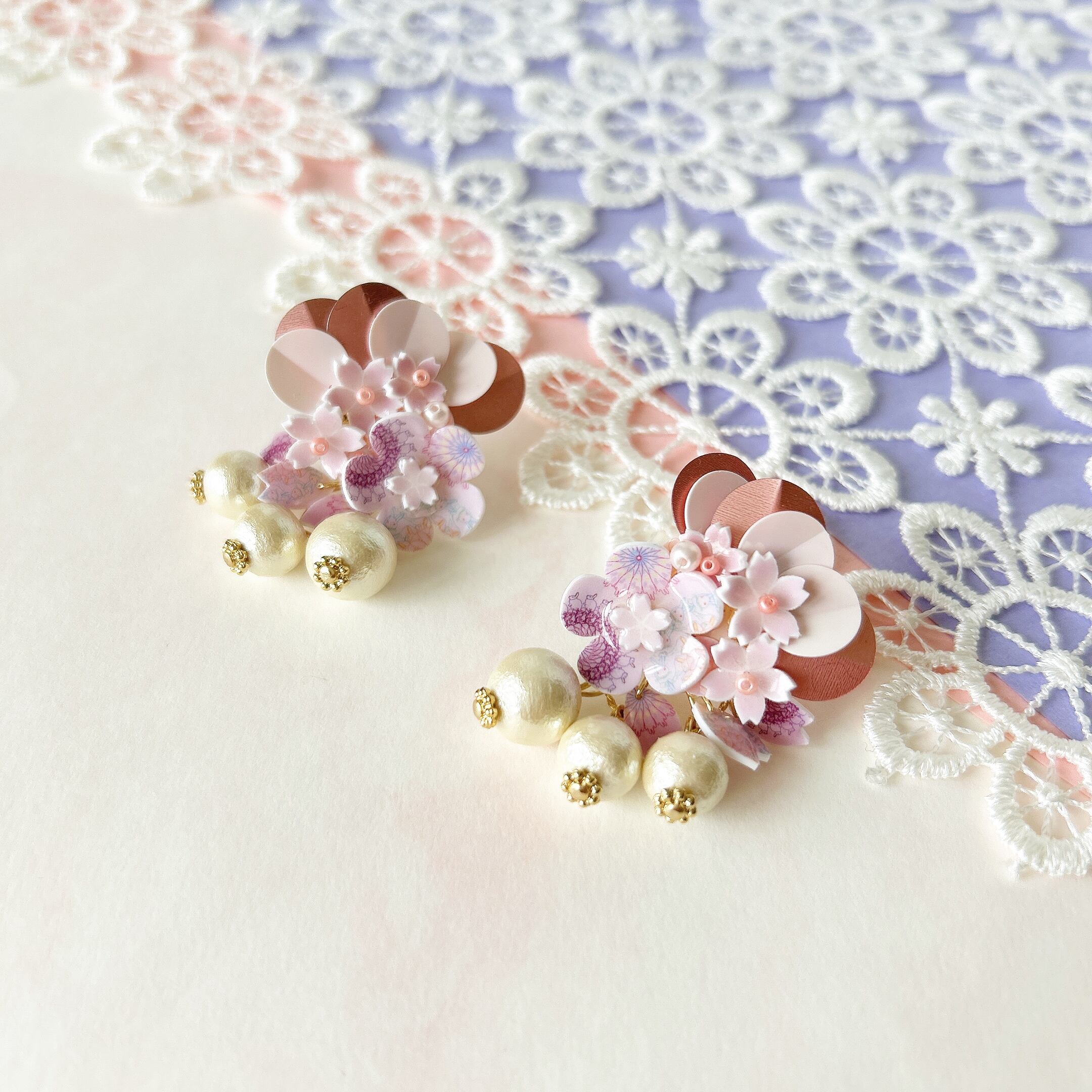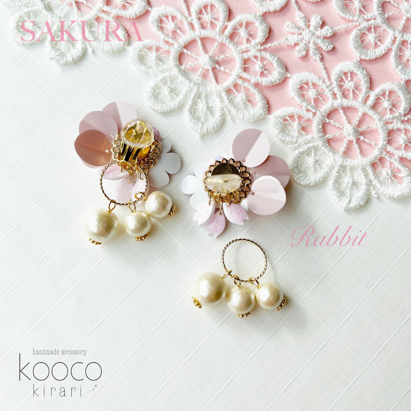 ウサギ柄の桜 コットンパール 2wayイヤリング