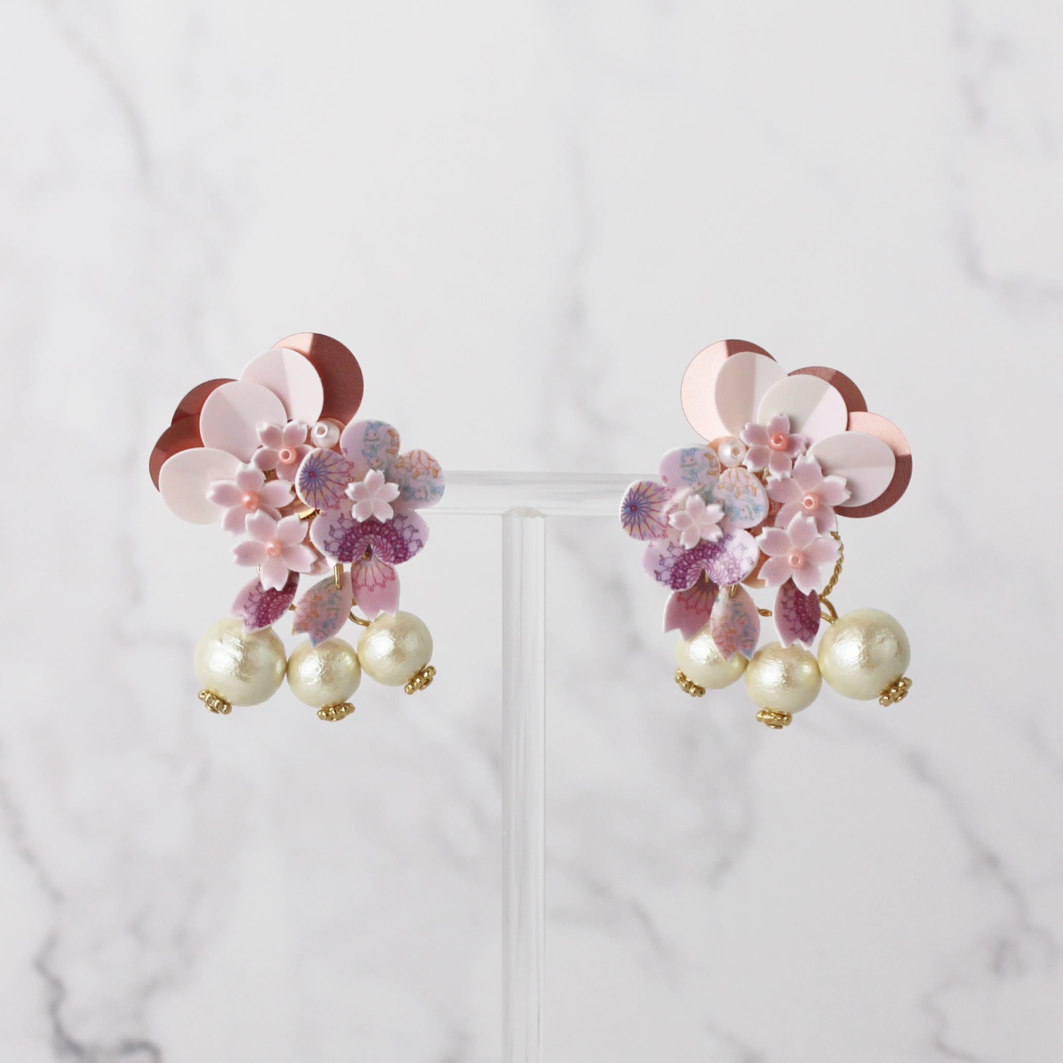 大小様々な桜チーフをバランスよく配置し、耳元を華やかに演出します。視線が耳元に集まることで、自然と小顔効果も期待できます。