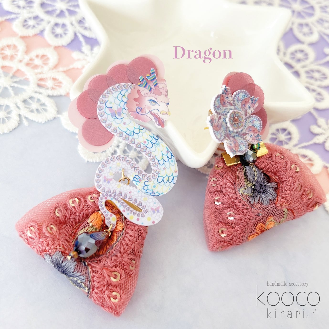 この龍&龍柄のお花ピアス/イヤリングは、あなたのオシャレに一味違った魅力を添えてくれることでしょう。