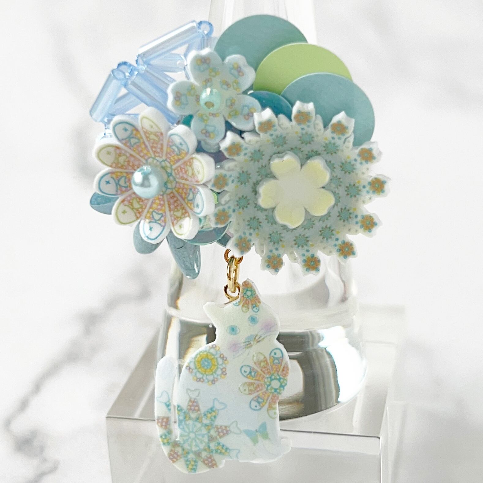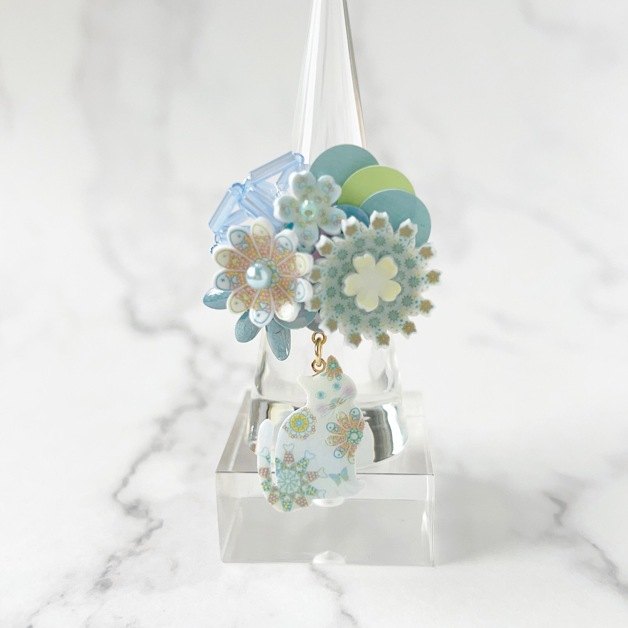 大小様々な猫モチーフや魚モチーフをバランスよく配置し、手元を華やかに演出します。