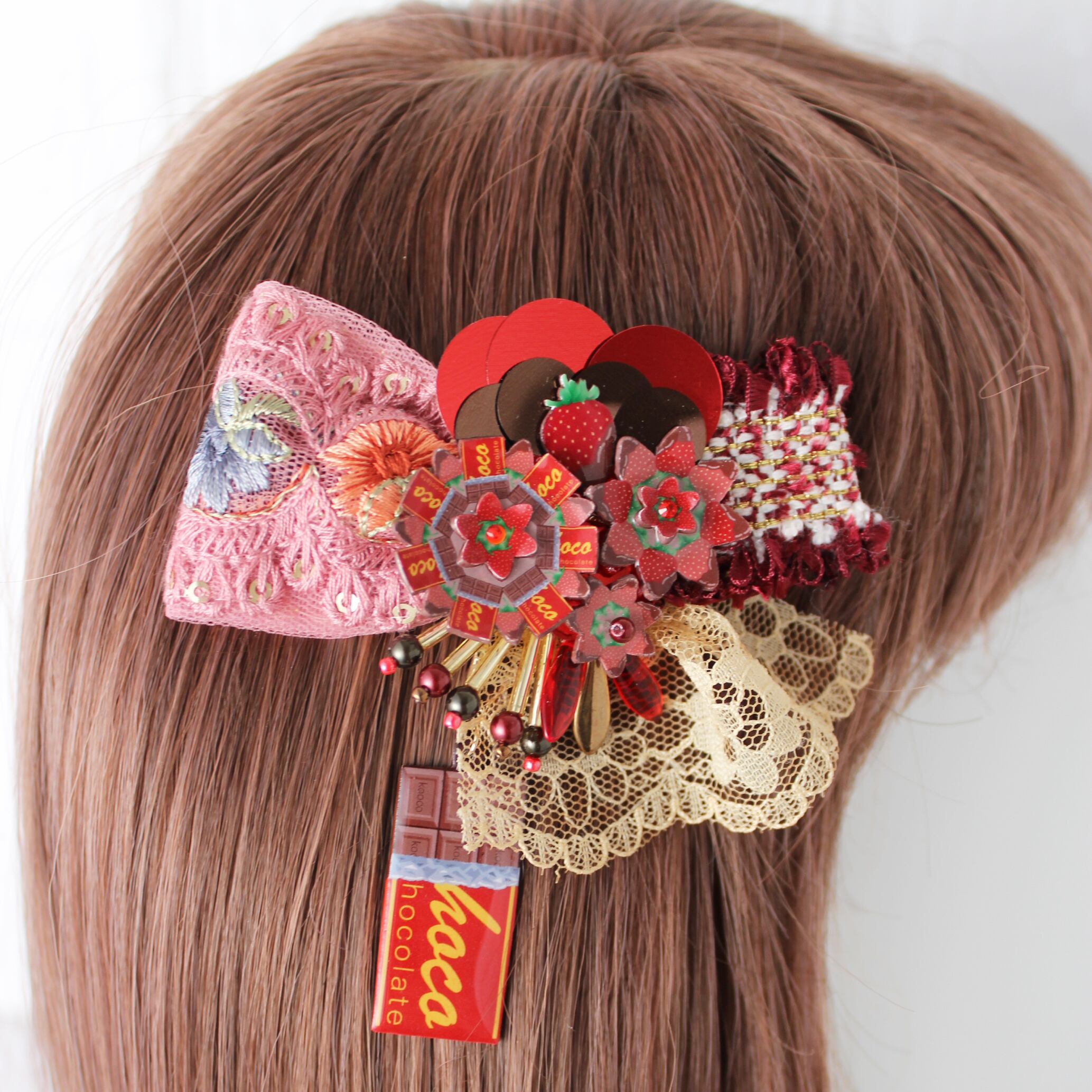 大小様々なチョコモチーフをバランスよく配置し、レースやツイードリボン、インド刺繍リボンと合わせて大変華やかなデザインです。
